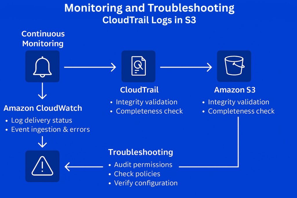 With the storage structure defined, the next step is to understand how CloudTrail delivers these logs to S3 and what mechanisms ensure their reliability and security.