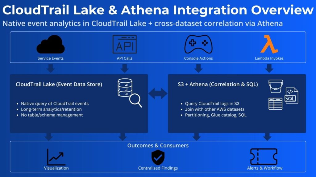 Beyond S3-based storage and Athena querying, AWS CloudTrail Lake provides interactive querying and long-term analytics capabilities. It also achieves this without the need for manual setup of tables or management of storage formats. Therefore, engineers can leverage CloudTrail Lake’s built-in event data store to perform on-demand search and investigations without managing schemas. However, Athena is still needed for querying and correlating AWS CloudTrail logs in S3 with other AWS service datasets for contextual analysis. Moreover, engineers should export or cross-reference insights from Athena and CloudTrail Lake to achieve both deep historical analytics and real-time event visibility.