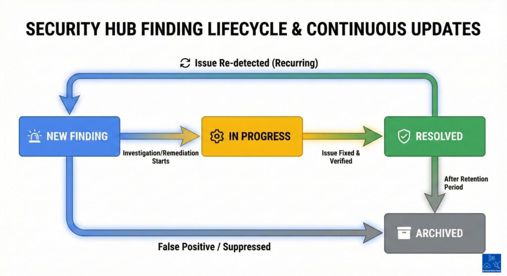 Security Hub findings are continually updated by the source services whenever new data becomes available or conditions change, and they do not remain static. Therefore, the source services drive updates to existing findings due to changes such as resolution, recurrence, or escalation. Subsequently, the current state of findings reflects the current risk status that helps security teams or automated workflows track whether an issue is new, ongoing, or no longer relevant.